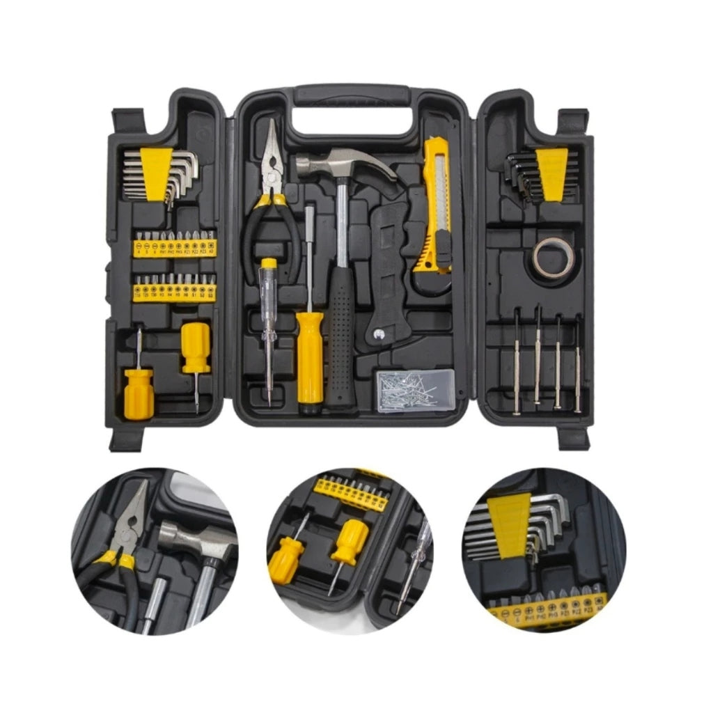 Composto por 200 peças, o kit inclui chaves de precisão, chaves allen, fita isolante, chave teste, bits, alicates, martelo, estiletes, arco de serra e muito mais.
